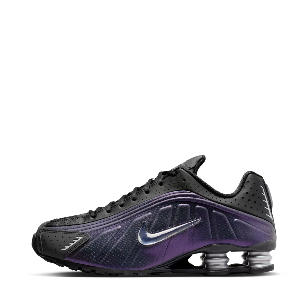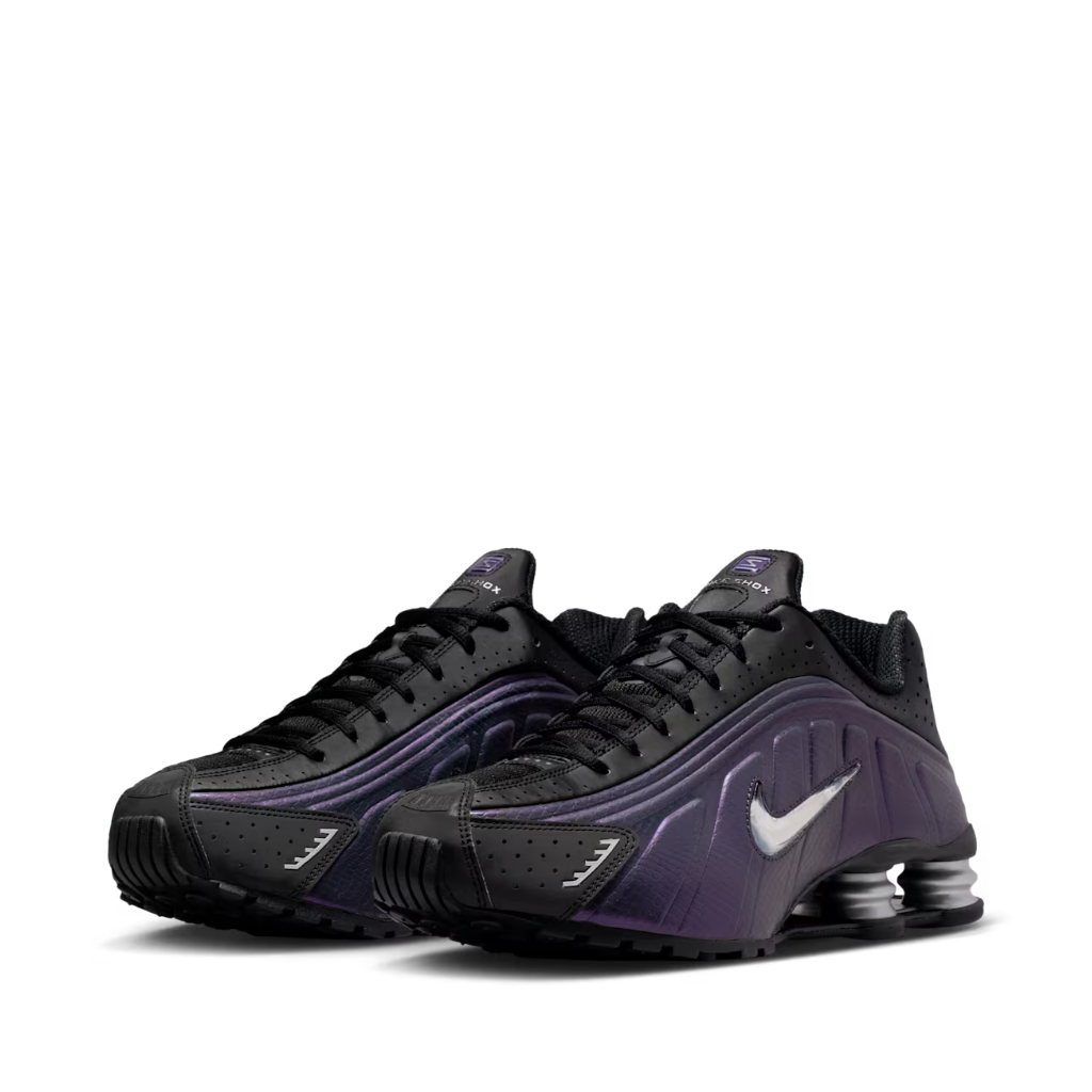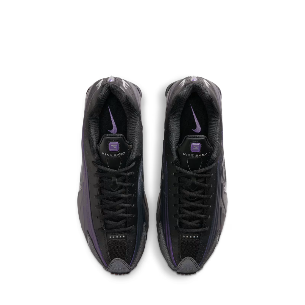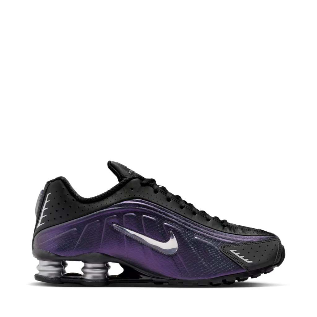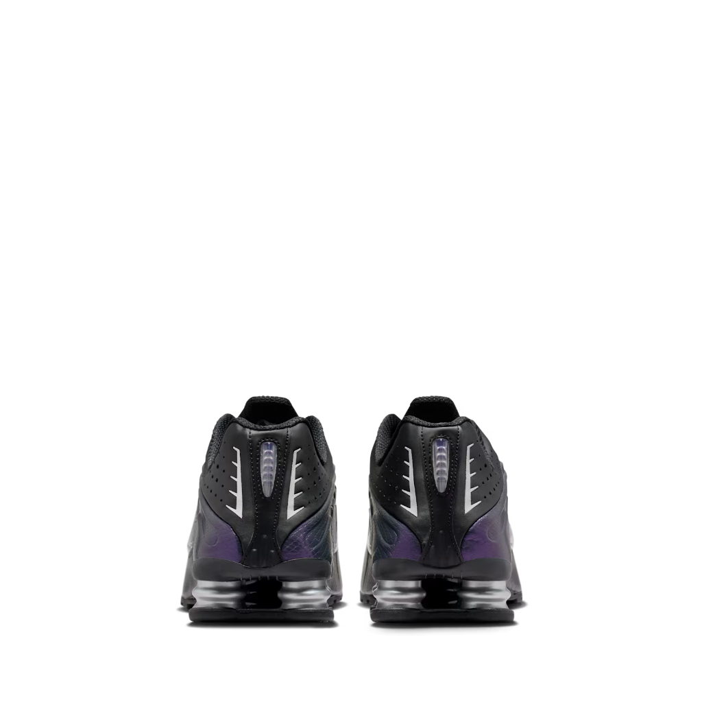 Los Shox R4, que debutaron de manera atrevida en el año 2000, rompieron el molde de tenis tradicionales con su look futurista. Combinan una parte superior sintética supersuave con ondas fluidas y perforaciones con láser, inspiradas en los trajes espaciales y otros equipos de astronautas. Cuatro columnas de compresión elevan el talón y así ofrecen una estructura estable y un rebote auténtico. Esta edición elegante, hecha en cuero sintético negro suave con el logotipo de Nike en plata metalizado, hace que los R4 sean aún más futuristas.