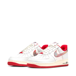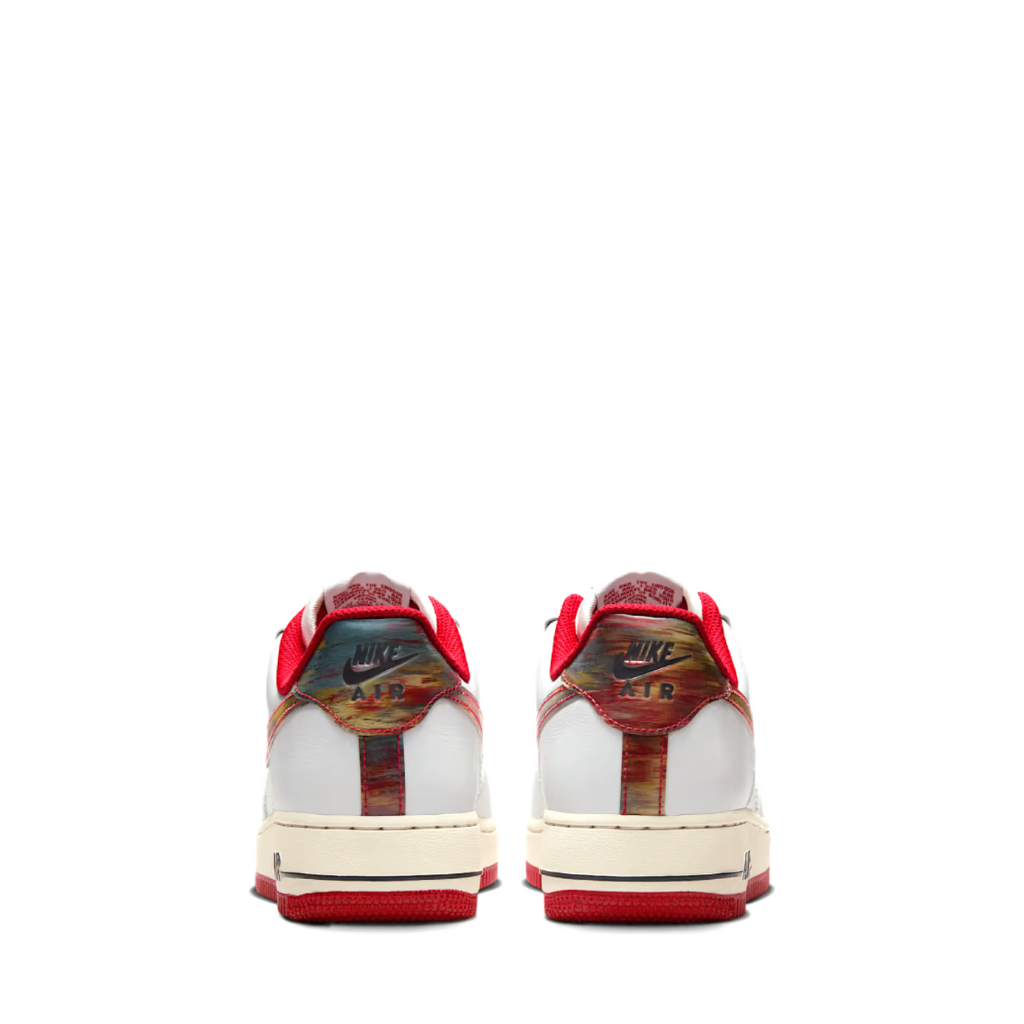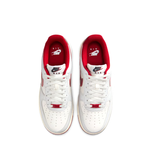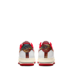 La zapatilla cuenta con una mediasuela beige con el emblema "AIR" en negro y una suela exterior roja. Los cordones blancos con detalles rojos de AF1 completan el diseño para un acabado armonioso.