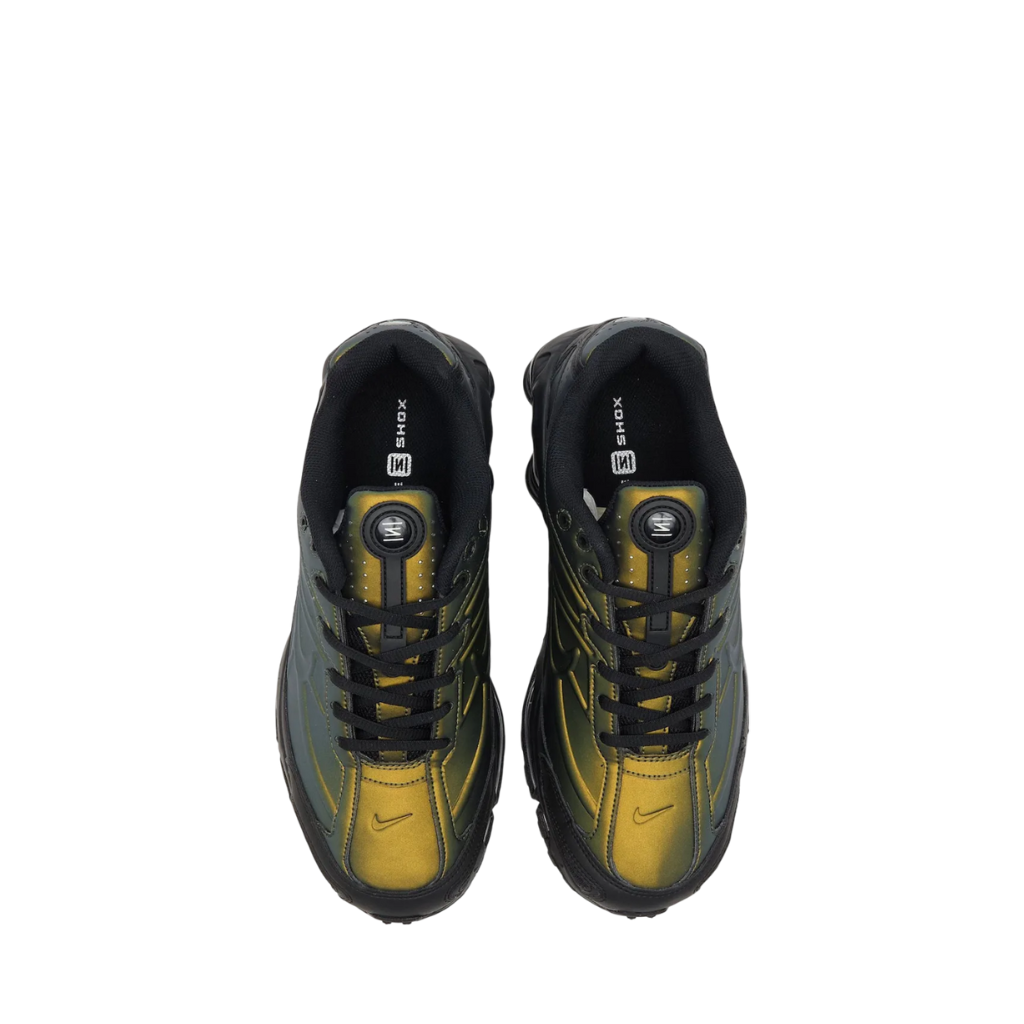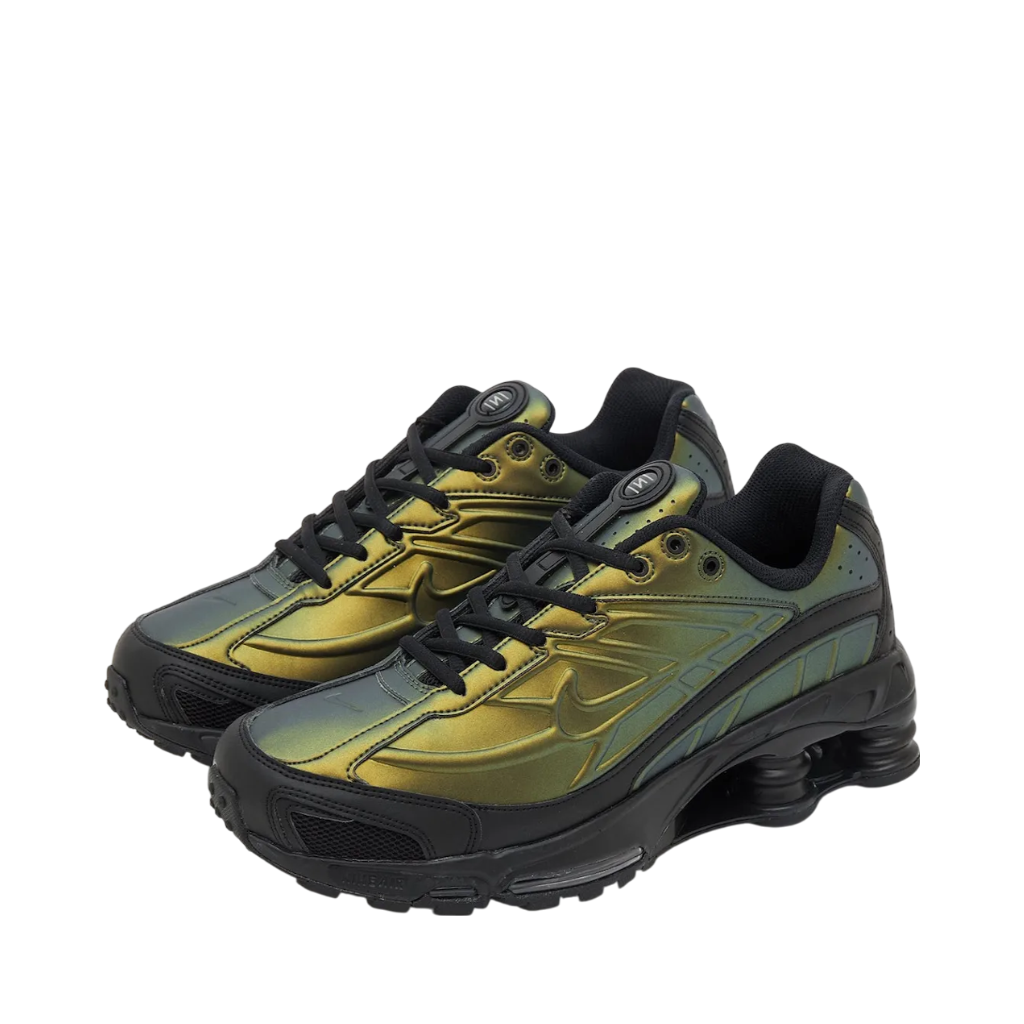 Las Nike Shox Ride 2 "Olive Flak" son un próximo lanzamiento que promete ser una declaración de intenciones con su estética única y la amortiguación característica de Shox. Esta versión de las Shox Ride 2 presenta una parte superior sintética moldeada con un llamativo acabado iridiscente en verde y dorado, diseñada para captar la luz y atraer todas las miradas. Esta parte superior, audaz y brillante, se equilibra con una discreta suela en negro azabache, que alberga las icónicas columnas Shox en el talón para una amortiguación reactiva y un look distintivo. Sutiles detalles como el Plata Metalizado también se incorporan al diseño.