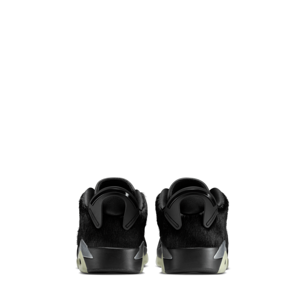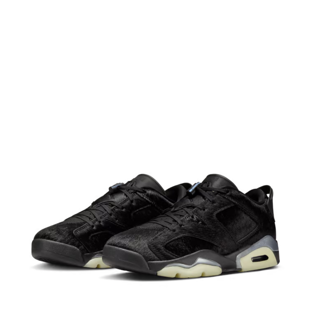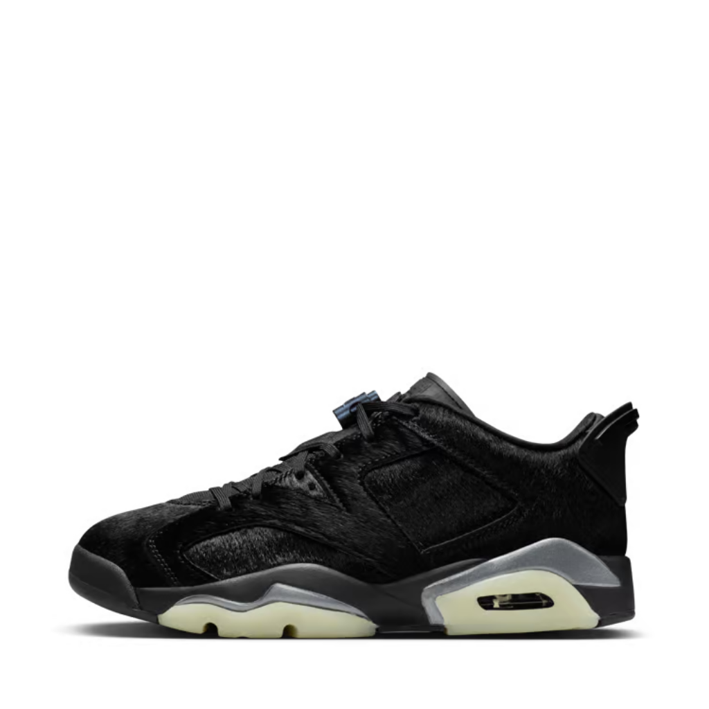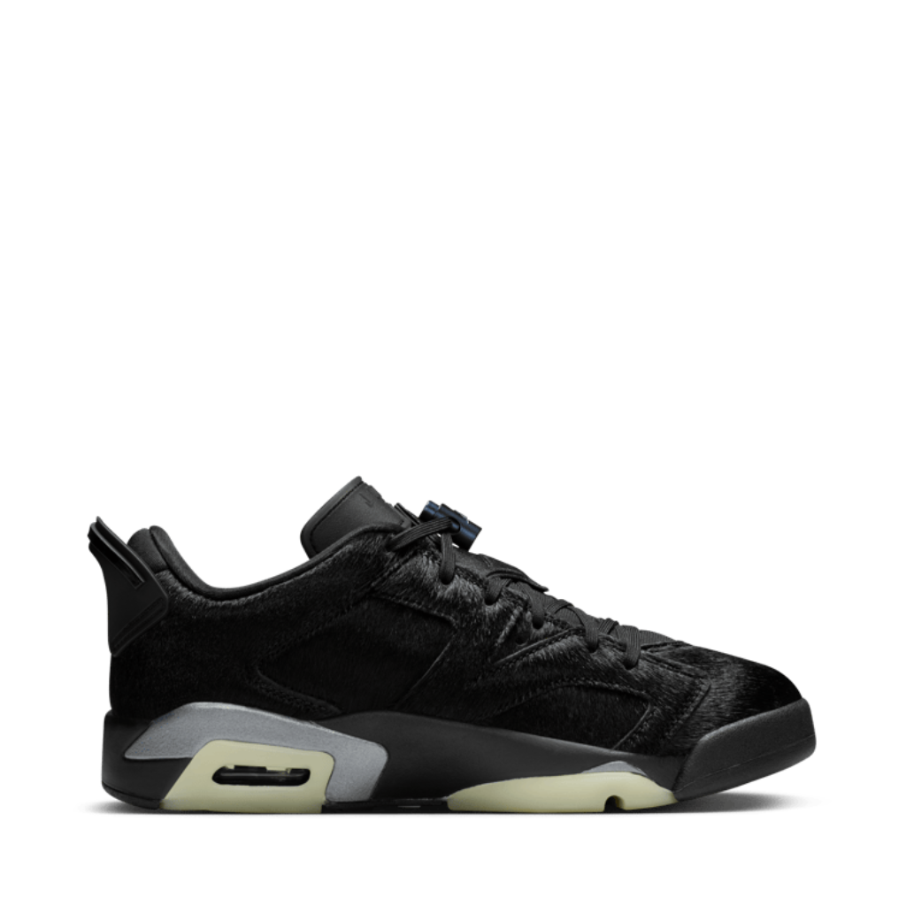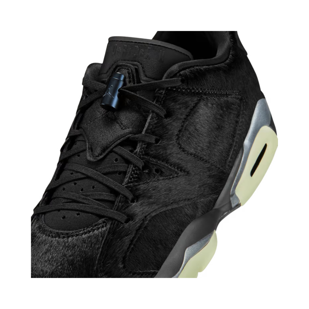 Con reminiscencias de la colaboración de Olivia Kim con las Air Jordan 4 a finales de 2019, estas Air Jordan 6 Low optan por un material exótico en la parte superior, cubriendo completamente la estructura exterior desde la puntera hasta el talón. Un gris oscuro en el delineador de ojos de la entresuela, que se encuentra sobre la unidad Air visible y el antepié, realza aún más el diseño, mientras que un tono crema opaco se utiliza para la distintiva suela de goma de las Air Jordan 6. Jordan Brand también elige un azul oscuro/morado metalizado para el cierre de cordones que viene unido al cordón original. Estas zapatillas no difieren mucho de las originales en negro/plata de 2002 .